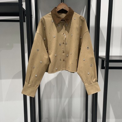 Autumn and winter wear hot diamond new lace bottom fashion hollow-out top foreign style diamond-inlaid small shirt
