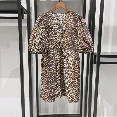 Pre-fall fashion front lace-up leopard print puffy sleeve doll skirt