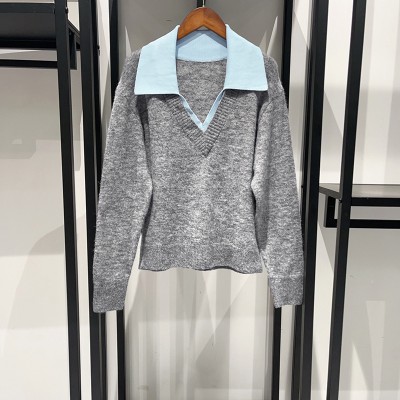 Autumn and winter fashion elegant patchwork lapel knitted pullover fake two soft tops